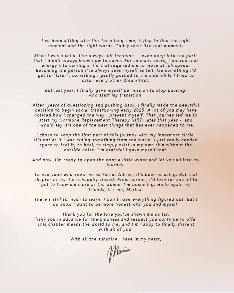 Summers’ announcement closes a chapter on her former identity: “To everyone who knew me as Yan or Adrian, it’s been amazing. But that chapter of my life is happily closed. From hereon, I’d love for you all to get to know me more as the woman I’m becoming. Hello again my friends, it’s me, Marina.” She concluded with gratitude and hope for the future: “There’s still so much to learn. I don’t have everything figured out. But I do know I want to be more honest with you and myself… This chapter means the world to me, and I’m happy to finally share it with all of you.”